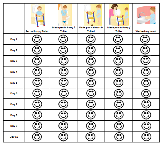 It's the same concept as the stars chart and the blank-cells chart, i.e. single row per day. When your child completes an action, like sitting on potty / toilet - let her paint inside the smiley shape below the relevant image.